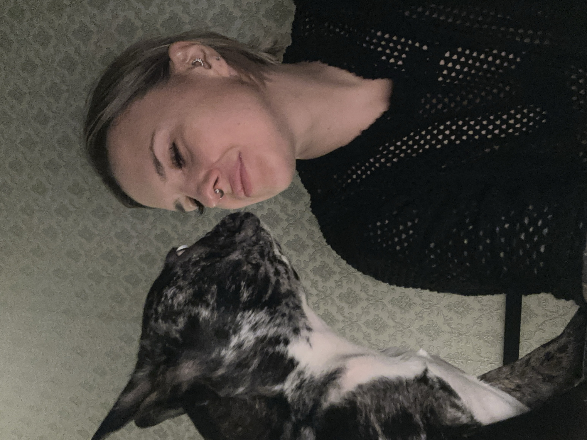 - "A woman with a nose ring and multiple ear piercings is looking down at a dog with a speckled coat of black, gray, and white" by FM-sJBub2, licensed under CC BY 4.0