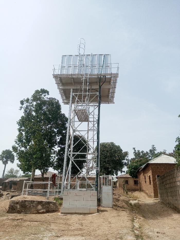 The image depicts a galvanized metal water tower in a dry, semi-urban or rural setting within Jos, Nigeria, under a hazy sky