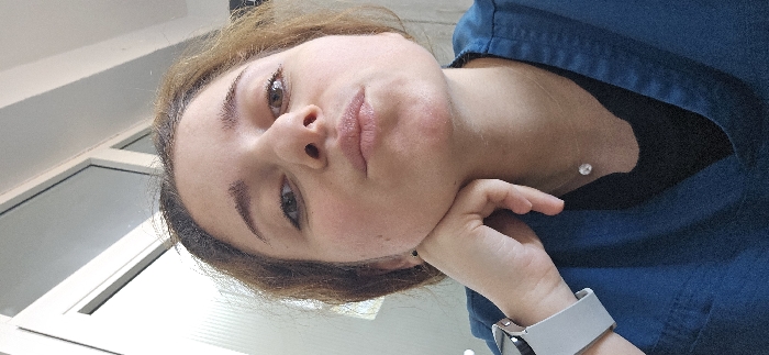 A close-up photograph depicts a light-skinned female individual with brown hair and dark eyes, positioned centrally and looking directly into the camera. Her lips are pursed, and her left hand is resting under her chin. Minor blemishes or redness are visible on her chin and cheeks. She is wearing a dark teal or blue V-neck scrub top over a black undershirt. A light-colored smartwatch with a rectangular face is present on her left wrist, and a small, clear stone pendant on a thin chain is around her neck. A dark stud earring is visible in her left ear. The background is blurred, showing indistinct interior elements, including what appears to be a white door or window frame with glass panels in the upper left, reflecting light. The specific location within the city of Pleven, Bulgaria, cannot be determined from the visual evidence presented.