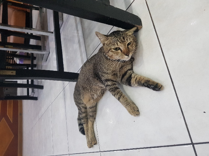 - "A tabby cat sprawls on a white-tiled floor, its head nearly touching a black table leg" by FM-ISafB3, licensed under CC BY 4.0
