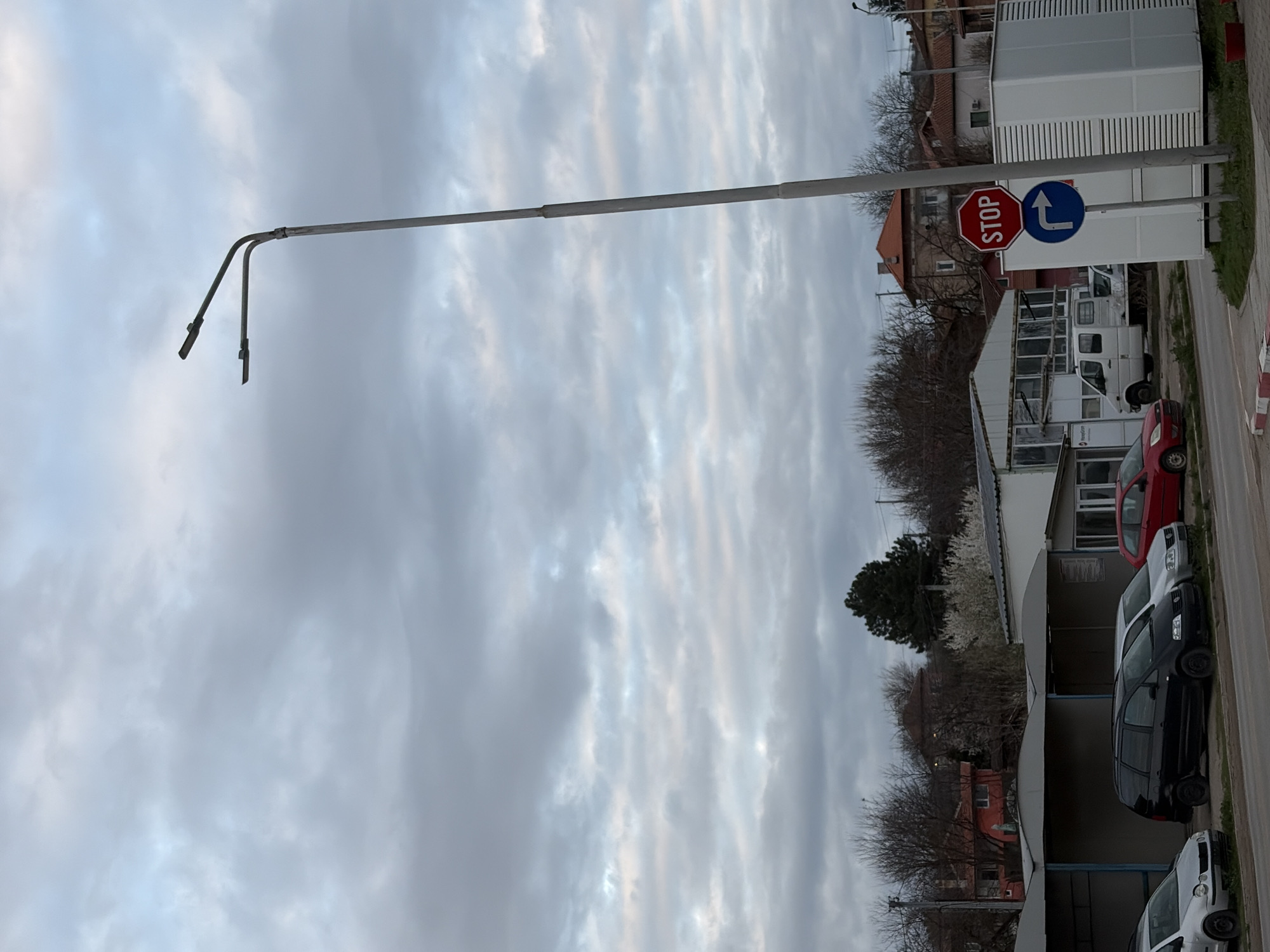 The image depicts a street scene in Lom, Bulgaria under a cloudy sky. A gray metal street lamp with a curved arm extends from the right to the left side of the frame. Below the street lamp are several white, rectangular buildings. A stop sign and a blue arrow sign pointing left are attached to a pole. A red car and a few white and black vans and cars are parked along the side of the street. Bare trees line the edge of the street behind the buildings. Some residential buildings are visible in the background.