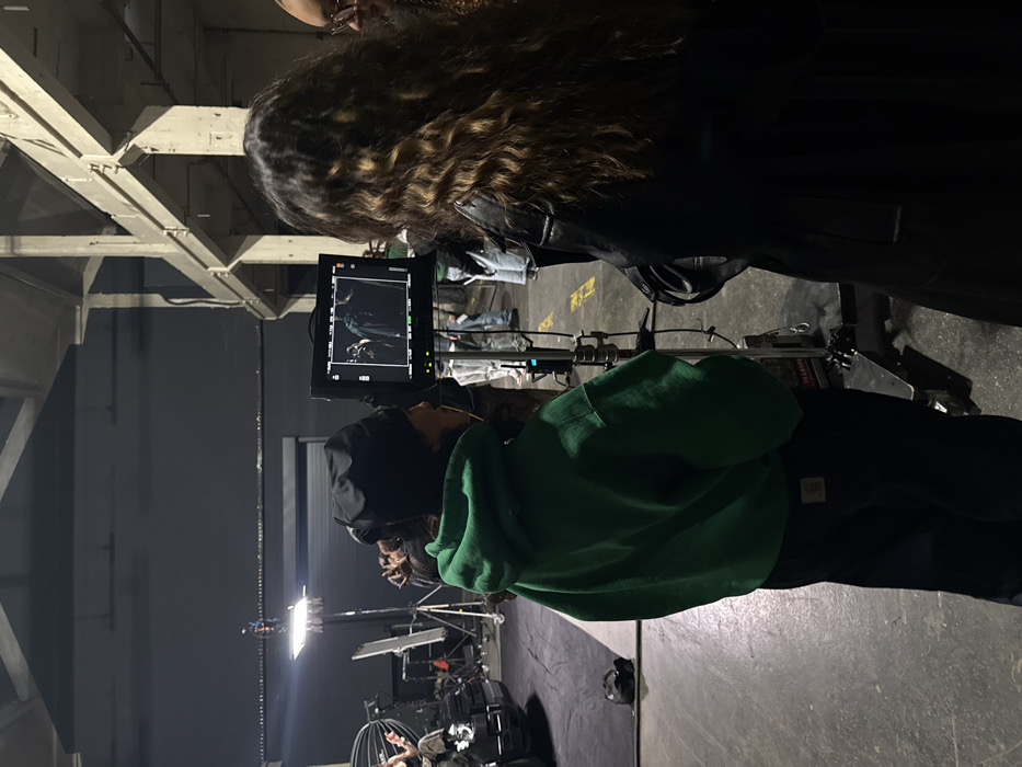 This image depicts an indoor film or photo production set located in Ivry-sur-Seine, France, characterized by a large industrial-style space with concrete floors, exposed concrete pillars and beams, and dark walls, indicative of a studio or warehouse conversion. In the immediate foreground, facing right, is an individual wearing a black beanie, a green Carhartt hooded sweatshirt, and dark work pants with a visible Carhartt logo on the back pocket. This person is looking intently at a flat-screen monitor mounted on a stand, which displays a scene with two figures, one prominently in a dark coat or cape. To the right of the monitor, partially obscured, is another individual with long, wavy brown hair, wearing a dark jacket, also focused on the monitor. A third person, wearing glasses, is partially visible behind and to the right of the second individual. The background reveals a bustling production environment. Various pieces of filmmaking equipment are visible, including large lighting fixtures on stands, a parabolic reflector, cables, and what appears to be a camera dolly or rig. Several indistinct figures are present in the deeper background, some standing and observing, one notably wearing a white protective suit. A large, dark roller door is visible against a dark wall in the mid-ground. The overall lighting suggests a controlled setup, with bright spotlights illuminating specific areas and the overall space appearing dim.