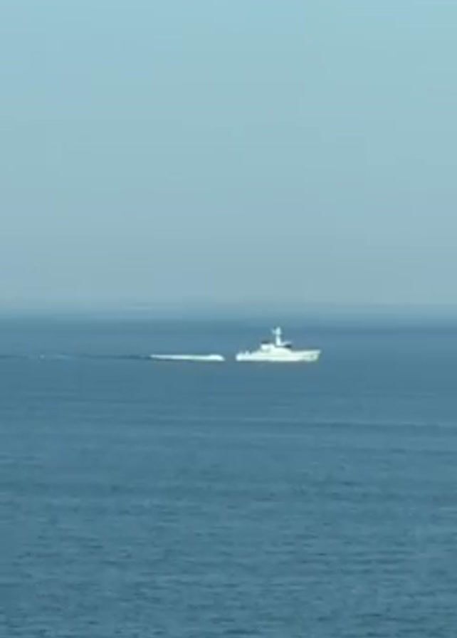 white ship moving across a calm, blue ocean. The ship leaves a white wake behind it, indicating its movement. In the far distance, on the horizon, there are faint outlines of what appear to be wind turbines. The sky is a pale blue, suggesting a clear, possibly hazy day. The angle is a distant shot, giving a wide view of the ocean and the ship's solitary presence.