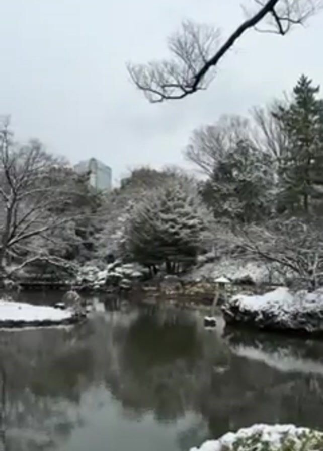 snowy landscape with a calm body of water, possibly a pond or lake, reflecting the surrounding trees and sky. The trees are covered in snow, and in the background, there's a building with a spire or tower. The scene is quiet and serene, conveying a wintery, tranquil atmosphere.