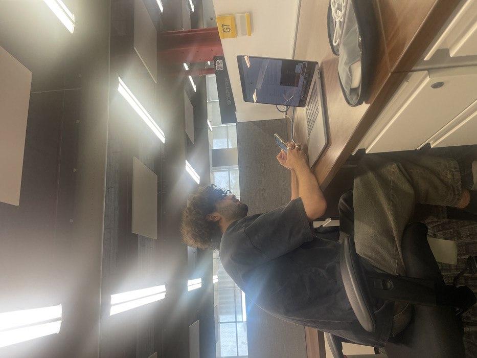 man sitting at a desk in a modern office space. The man is wearing a black t-shirt, jeans, and is looking down at his phone. He is seated in a black office chair, and his right arm is resting on the desk, while his left hand is holding the phone. There is a laptop computer and a black pouch with earbuds on the desk in front of him. The room is lit by fluorescent lights and has a brown ceiling. The desk is made of wood and has a white drawer underneath. The office walls are grey. The location of the image is a modern office building in Newark, New Jersey, USA, with coordinates 40.744 N, 74.169 W. The man is likely working or taking a break from work. The image captures a moment of quiet contemplation in a bustling office setting.