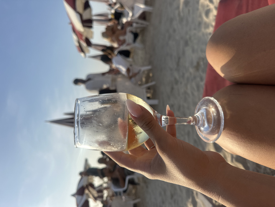 - "A first-person perspective image captures a hand holding a condensation-covered wine glass containing light-yellow liquid (white wine) at a beachside establishment in Tel Aviv, Israel" by FM-E1Rr12, licensed under CC BY 4.0