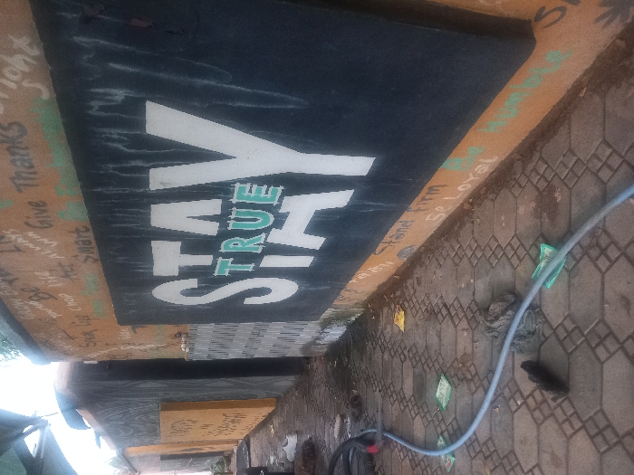 The image depicts an outdoor urban environment, likely an alleyway or the exterior of a commercial structure, in the city of Unknown, Unknown. The scene features a paved ground of interlocking concrete pavers, soiled with dark stains and littered with a light blue hose, a black sandal, a white sneaker, a crumpled dark cloth, and several green plastic wrappers. A textured wall, painted orange-brown, runs along the right side, adorned with graffiti in white and green text, including phrases such as "GIVE THANKS," "SMART," "SPEAK UP," "CHOP LIFE," "STAND FIRM," and "BE LOYAL." A large black rectangular sign is mounted on this wall, displaying "STAY" in prominent white capital letters with "TRUE" in smaller green capital letters centered beneath it; the sign exhibits vertical white streaks. Further left along the wall, a grey building section with a vertical orange panel is visible, with a metal grate and plumbing fixtures situated on the wall between the main sign and this structure. A green tarp or awning is partially visible overhead in the upper left corner. No individuals are present, and no active interactions are depicted. The environment appears worn and somewhat untidy.