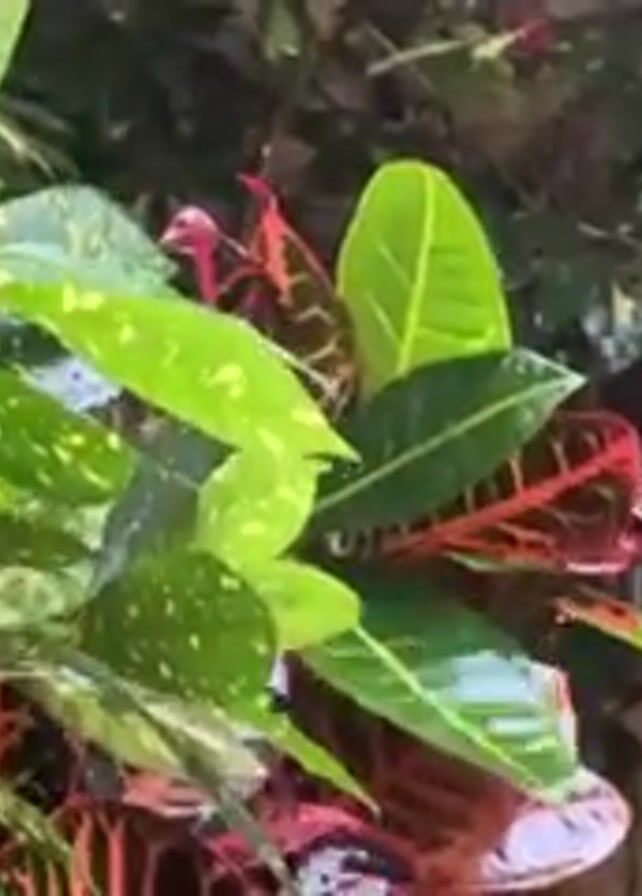 The camera is positioned at a low angle looking up at a cluster of plants, presumably outdoors. The plants include varieties of Croton, characterized by their brightly colored leaves in shades of green, yellow, and red. Some leaves are speckled. The leaves appear wet, possibly from rain or watering. The background features other green foliage and what appears to be a textured wall or surface. The scene is still, with no visible movement other than the subtle shifting of leaves.