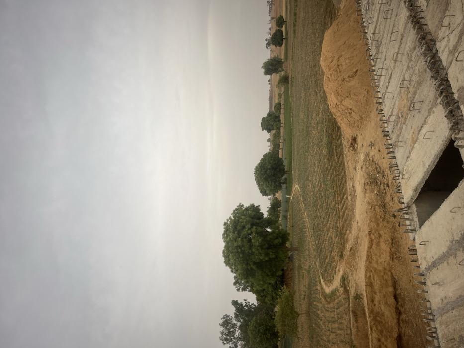 A rural landscape fills the frame, a cloudy sky dominating the view. Green fields stretch out, dotted with clusters of trees. A dirt path weaves through the fields, leading into the distance. In the foreground, a raw concrete structure, possibly a building under construction, sits partially in the frame. Protruding metal bars reinforce the concrete. Adjacent to the structure, a small pile of dirt sits near the edge of the field.