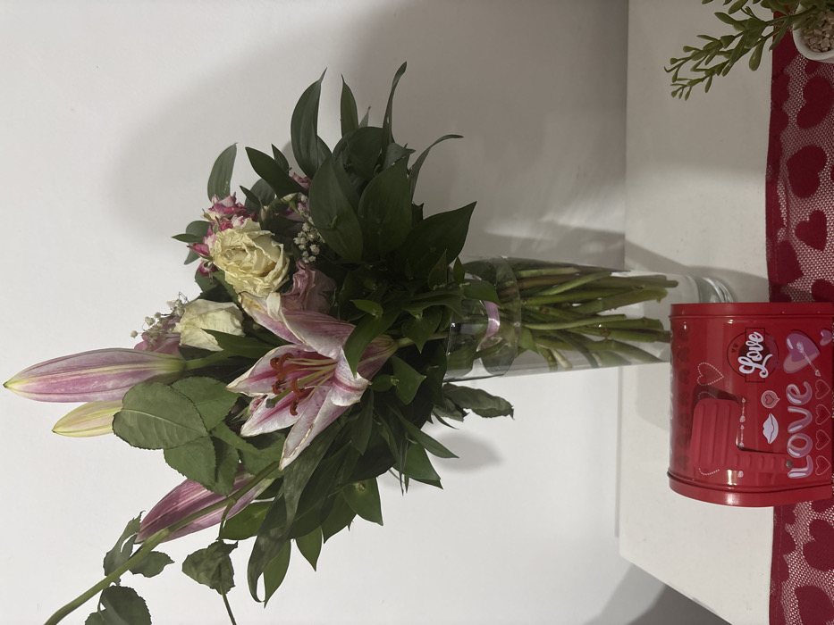 A bouquet of flowers, featuring lilies and roses, lies horizontally on a white surface, partially held within a clear container. The lilies are pink and white, while the roses appear yellowed. To the right of the bouquet sits a red tin can adorned with Valentine's Day themed images and the word "Love". A decorative piece with red hearts and green leaves is also partially visible in the background.