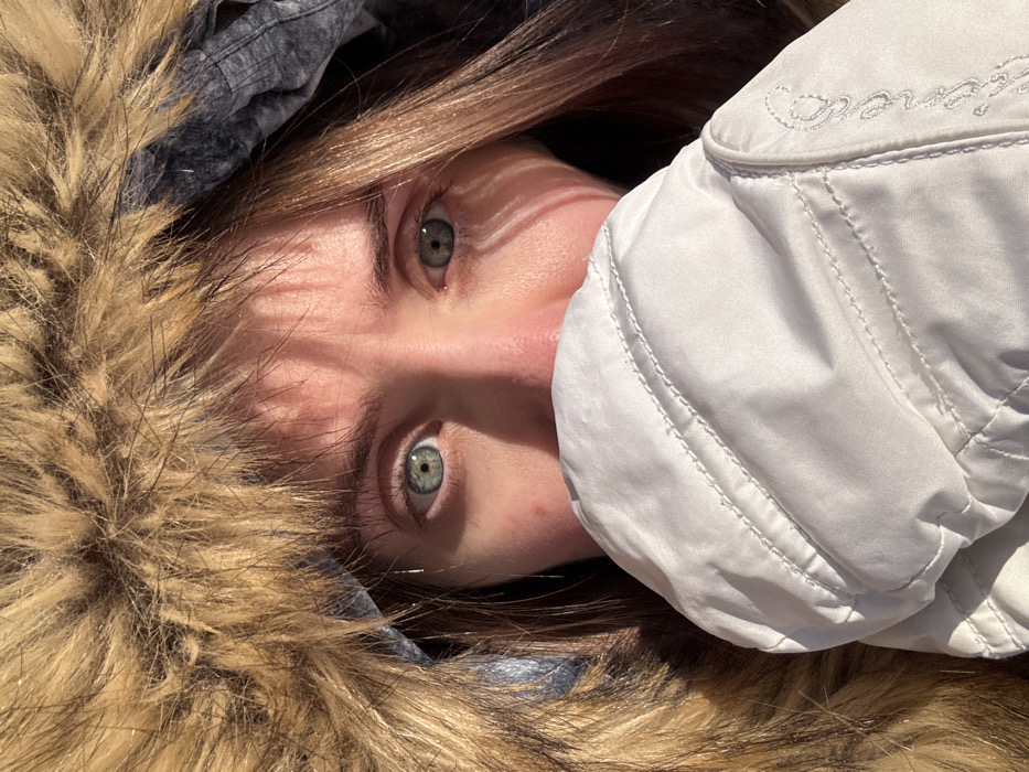 An individual is depicted in a close-up, eye-level shot, outdoors in Perm, Russia, under direct sunlight. The subject, likely female, has blue-green eyes and light brown hair visible beneath a substantial fur-lined hood. The hood features brown and blonde synthetic fur, with visible ice particles or reflections on the fibers. Strong, direct sunlight casts vertical shadow streaks across the subject's forehead and nose. The lower portion of the subject's face, including the mouth and chin, is obscured by the light grey or off-white cuff of a winter jacket, which has visible stitching and a slightly quilted texture. The subject looks directly forward, engaging the viewer. Skin tone appears fair, with a reddish hue on the exposed cheeks, consistent with cold exposure.