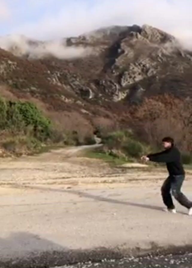 A man stands on an asphalt surface, which is a paved road or parking area, and performs dance moves. He wears dark clothing and appears to be moving rhythmically. In the background, a mountain rises, its peak partially obscured by low-hanging clouds or fog. The slopes of the mountain are covered in vegetation, with trees and shrubs visible. The landscape suggests a rural or natural setting, possibly a mountainous region with a mix of forest and open spaces. The lighting indicates it is daytime, and the weather seems to be overcast or partly cloudy.