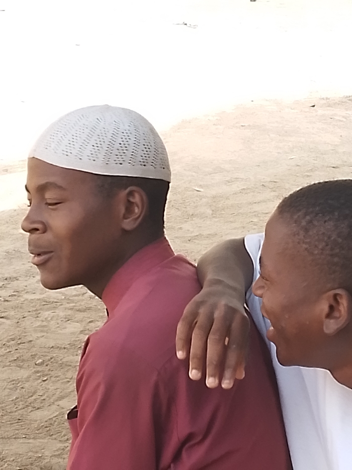 Two young Black males are depicted outdoors in Gwagwarwa, Nigeria. The individual on the left is seen in profile, facing left, wearing a white crocheted kufi cap and a dark red long-sleeved collared shirt. His eyes are downcast, and his mouth is slightly open. The second individual, positioned to the right and partially visible, faces towards the first, wearing a white t-shirt. His right arm rests on the first individual's left shoulder. He is smiling broadly, revealing teeth. The immediate environment consists of a light brown, sandy or dirt ground surface under daylight conditions.