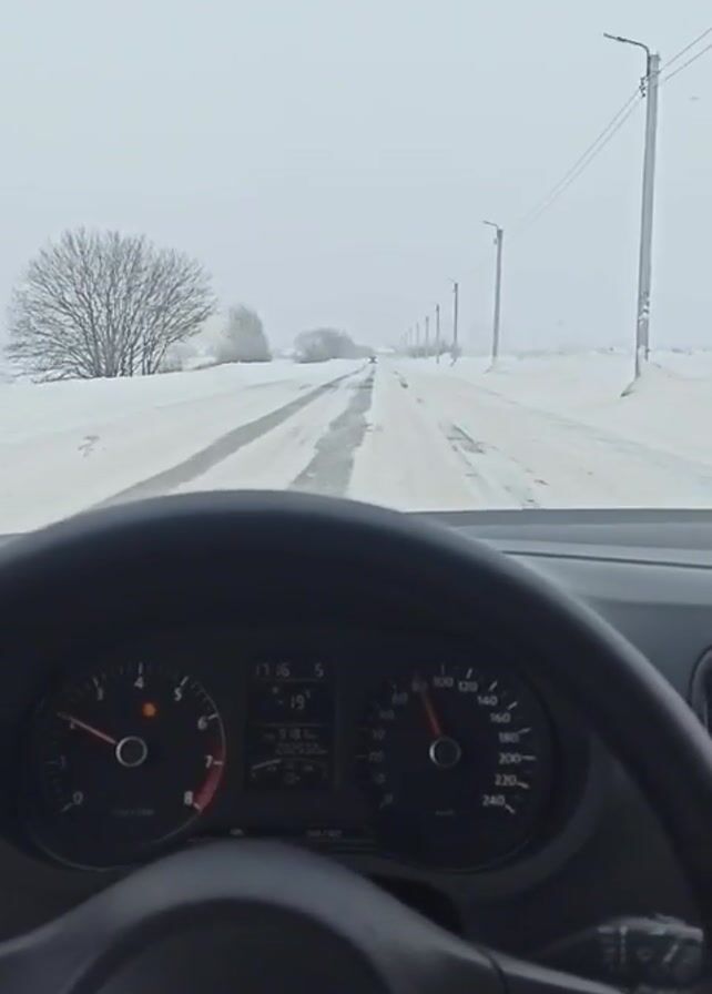 A dashboard camera records a car driving on a straight, snowy, rural road during the daytime