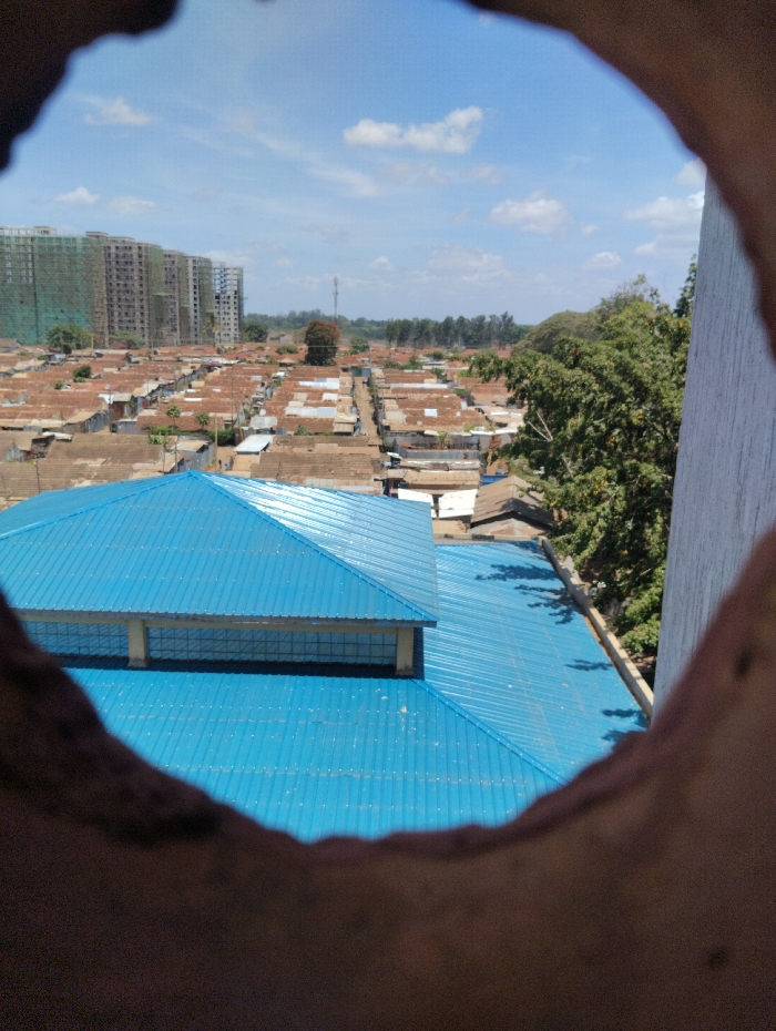 The image presents an elevated view of a Thika, Kenya, urban landscape, framed through an irregular, dark, organic-shaped opening in the immediate foreground, possibly a gap in a wall or foliage. The most prominent subject in the foreground is a large, blue corrugated metal roof of a building, featuring a raised section with visible ventilation slats. Below the horizon, the midground is dominated by a dense grid of numerous low-rise structures, primarily exhibiting reddish-brown corrugated iron roofs, characteristic of residential or informal commercial buildings. These structures are closely packed, with narrow pathways or unpaved roads delineating blocks. No individuals are visible. In the background, to the left, a cluster of several multi-story buildings under construction are visible, enveloped in green scaffolding. Towards the center-right, a dense stand of green trees partially obscures the view. Further in the distance, a tall, slender mast or cellular tower rises above the tree line. The sky above is clear blue with scattered white cumulus clouds, indicating fair weather conditions. The distant horizon features a flat landscape with a faint treeline.