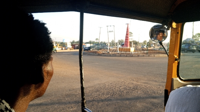 From inside a vehicle, likely a rickshaw, the scene shows a road leading to a roundabout