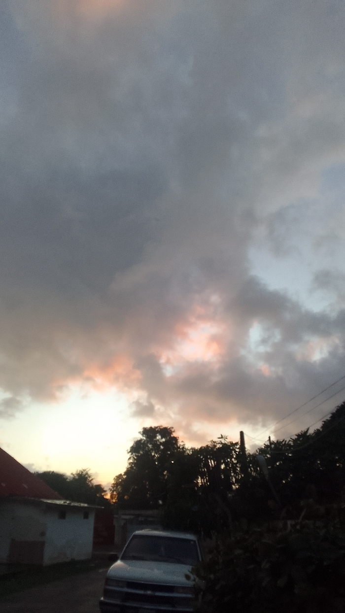 A low-angle shot captures a cloudy sunset scene. A white pickup truck sits on a street in the foreground. Behind the truck, greenery mixes with utility poles. To the left, a weathered white building with a red roof is visible. The sky dominates the frame, filled with gray clouds tinged with pink and orange light from the setting sun.