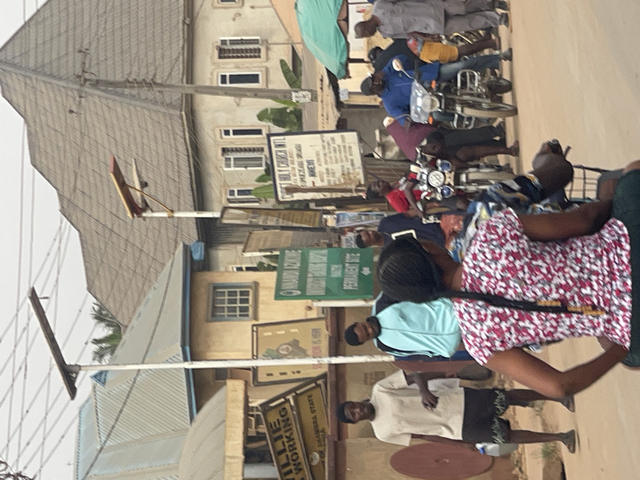 A street scene with buildings and people is captured. Signs advertising businesses or organizations are visible. People are walking and on motorcycles. The scene includes buildings with multiple windows and a roof. An assortment of colors is present from the clothing of the people to the paint of the buildings and signs. Overhead electrical lines can be seen.