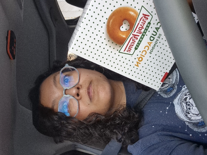 A person with glasses lies on a gray surface, possibly a car seat. A box of Krispy Kreme donuts rests on their chest. The box is white with green polka dots and features a glazed donut with a heart-shaped center. The person wears a blue t-shirt with a constellation print. The background is blurred, focusing on the person and the donut box.
