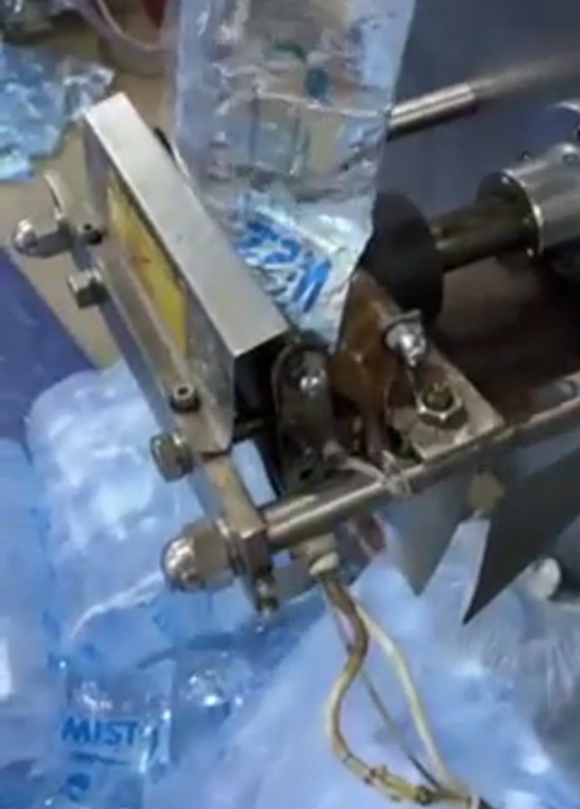 A close-up shot shows a machine filling and sealing individual clear plastic bags of water