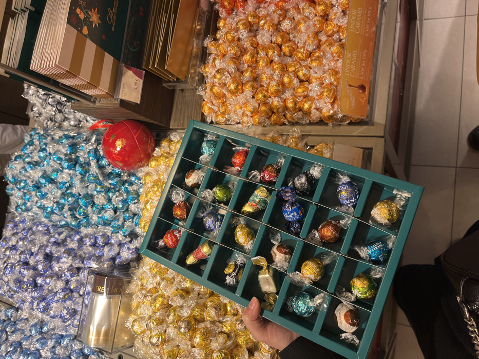 The image depicts an indoor retail scene, likely a specialty chocolate store or a dedicated section within a larger retail establishment in Paris, France. A person's left hand, clad in dark attire, holds a teal-colored, compartmentalized box containing twenty-five individually wrapped Lindt Lindor chocolate truffles of various flavors and colors. Labels like "WHITE" and "TIRAMISU" are visible on some wrappers. In the background, multiple bulk displays of Lindt Lindor truffles are visible. To the left, large piles of individually wrapped truffles are segmented by color: light blue/lavender, bright blue, silver/grey, and gold. A clear rectangular container with "RECHO" visible on its side is partially submerged in the gold truffles. To the right, another large pile of truffles is wrapped in orange foil, identified by a visible sign as "LINDOR CARAMEL" priced at "6,50 € les 100g." Above this, shelves display various small packaged items, including greeting cards, one priced at "1,90 €." A red spherical ornament with gold accents is placed amongst the truffles on the right side. The flooring is light-colored tile.