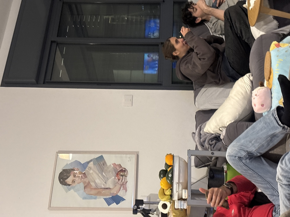 The scene depicts an interior view of a contemporary living room, specified to be located in Givatayim, Israel, at night. Three individuals are partially visible, occupying a large grey sectional sofa. In the mid-ground, a female with dark hair pulled back, wearing a dark brown hooded sweatshirt and dark trousers, is seated. She holds a small object, possibly a spoon or food, to her mouth, appearing to be consuming something, with a slight smile directed towards the left. To her immediate right, a male with dark, curly hair, wearing a light grey top, is also seated on the sofa, partially obscured. His right hand is near his mouth, suggesting a similar action. In the foreground to the left, the lower body of a third individual is visible, wearing light blue jeans and black socks. A red long-sleeved top is partially seen. Their left hand is raised, making a "thumbs up" gesture, while holding an unidentified dark object. Between the foreground individual and the female on the sofa, a small pink, pig-shaped plush toy rests on the sofa. A light-colored round wooden coffee table is partially visible in the bottom right, featuring a round cookie or biscuit on a blue and white patterned cloth with "Hello Winnie The Pooh" text. On the white wall to the left, a framed artwork depicts a young person, rendered with abstract blue and skin tone elements, holding a red apple. Beneath the artwork, a metal shelving unit holds a white bowl filled with fruits, including bananas, oranges, and avocados. Other items on the shelf include a roll of toilet paper, several small containers, a black webcam-like device, and a green appliance base. To the right, a large dark-framed window extends from floor to ceiling. Through the window, reflections of what appear to be television screens displaying blue and red hues are visible, along with reflections or distant views of illuminated windows from a tall building. A white electrical switch plate is mounted on the wall below the window. The overall environment suggests a casual, domestic setting.