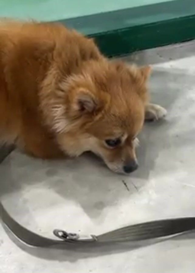 A small dog with brown fur lies on a gray concrete floor, looking down. It is connected to a green leash. A green wall with some white details is visible in the background. The dog lifts its head slightly to the left and looks around.