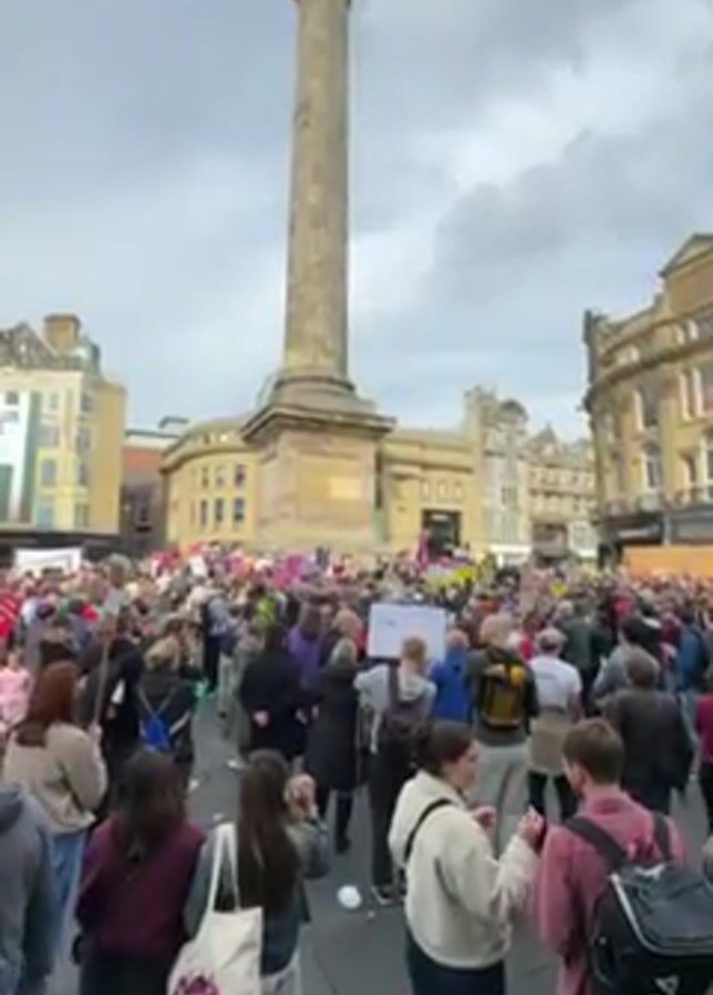 A large crowd of people are gathered in a square, facing a raised platform. The sky is cloudy. A tall stone column stands in the center of the square. Buildings surround the square. Many people are holding signs. Some people appear to be filming the event with their phones. The crowd is diverse. Some people are wearing backpacks. There is litter on the ground.