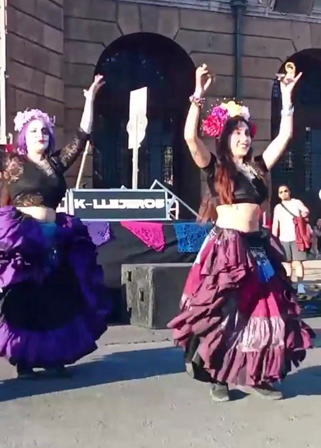 Two dancers in Day of the Dead makeup and colorful costumes perform in front of a stage with the words "K-LLEJEROS" displayed. The dancer on the left wears purple and black, with a floral headpiece. The dancer on the right is in red and black. They both have their arms raised and are holding small items. A crowd is visible in the background, and the setting appears to be an outdoor event.