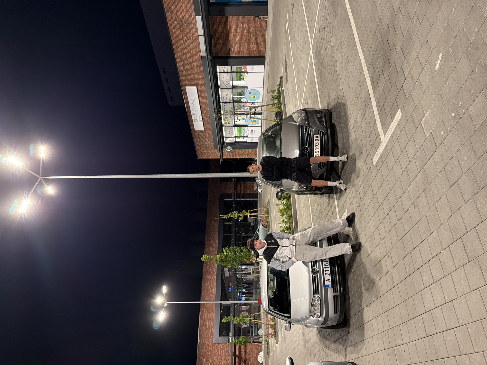 Two young men are posing on and near parked cars in a parking lot outside a building. One man is lying across the hood of a silver Volkswagen Golf, license plate A 2118 P. The other man is leaning against a gray Opel Astra, license plate B5193XA. The building is a red brick structure with windows and signage for "SOPHARMAcy аптека" (pharmacy). The area is illuminated by modern streetlights. The location appears to be in Burgas, Bulgaria, based on the license plates and signage.