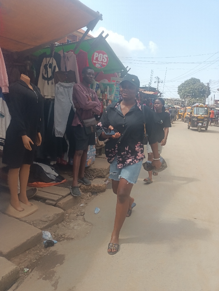 This image captures a bustling street scene in Unguwar Kaya, Nigeria, under daylight with a partly cloudy sky. In the foreground, a woman walks towards the right side of the frame, dressed in a black button-up shirt with pink floral patterns, distressed light blue denim shorts, a black baseball cap, and dark slide sandals. She holds a black smartphone in her left hand and has a black shoulder bag with a gold chain strap. To the left, a market stall is visible, covered by a brown tarp awning over a green tarp banner displaying "POS INGUWAR KAYA". Various clothing items, including hoodies with graphic designs and gray sweatpants, hang for display. A headless mannequin torso, wearing a black long-sleeved dress, stands on a light-colored wooden platform at the edge of the stall. Behind the mannequin, a man stands with his arms crossed, wearing a maroon long-sleeved shirt, dark shorts, and dark clogs, with a black shoulder bag slung across his chest. Behind the foreground woman, another woman walks along the street, wearing a black t-shirt and light shorts, carrying a dark bag. The ground consists of an uneven, unpaved road with visible debris and irregular concrete edges forming a rudimentary sidewalk. In the background, several yellow three-wheeled auto-rickshaws (Keke Napep) are present on the road, indicating traffic. Utility poles with overhead wires are visible, along with distant buildings and foliage.