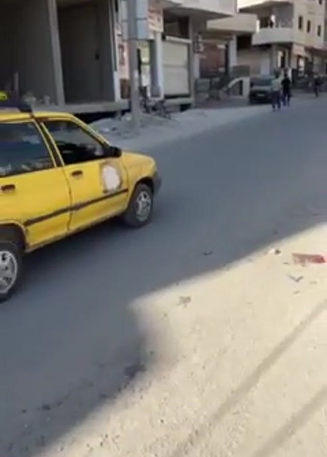 street scene in what appears to be a city. The road is paved but has a good deal of litter scattered on it. A yellow taxi car is parked on the left side of the road. Buildings are visible on both sides of the road, some of which appear to be under construction. Several people are walking along the sidewalk. The weather appears to be sunny.