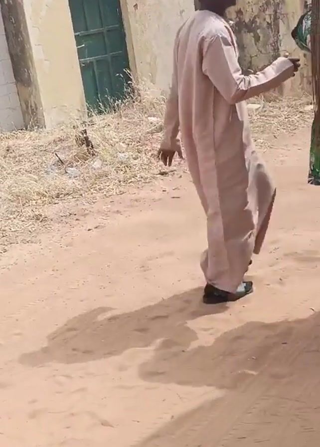 A man in a long tan robe and white cap walks across a sandy, dirt area. He is wearing dark sandals. To his right is a woman in a green and patterned dress. They are near a building that has a green door. There is straw or dried grass on the ground. The man gestures with his right arm.
