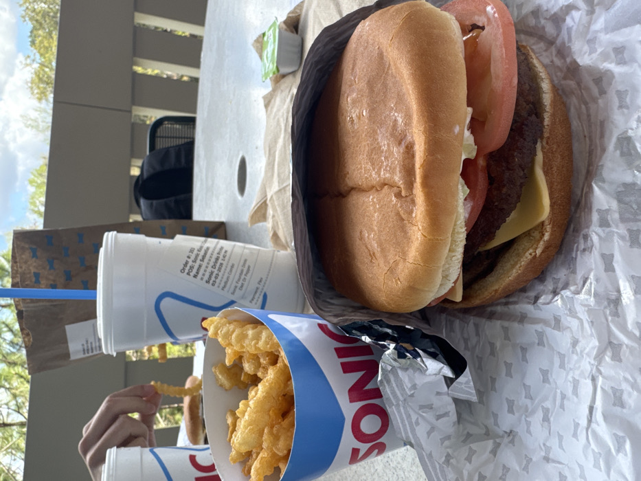 The scene depicts an outdoor meal at a Sonic Drive-In restaurant in Gainesville, United States of America