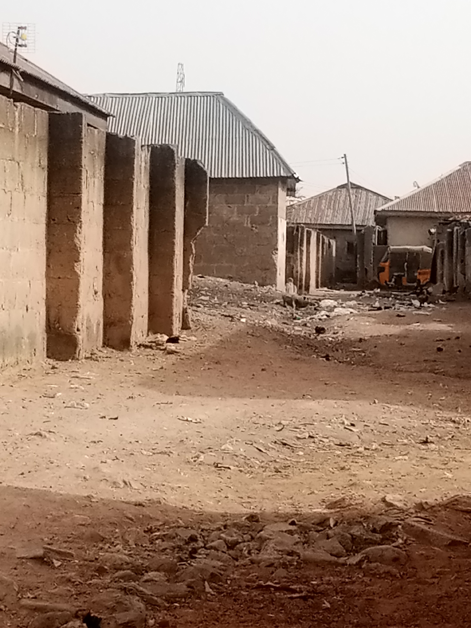 The image depicts an unpaved street in a residential area of Minna, Nigeria