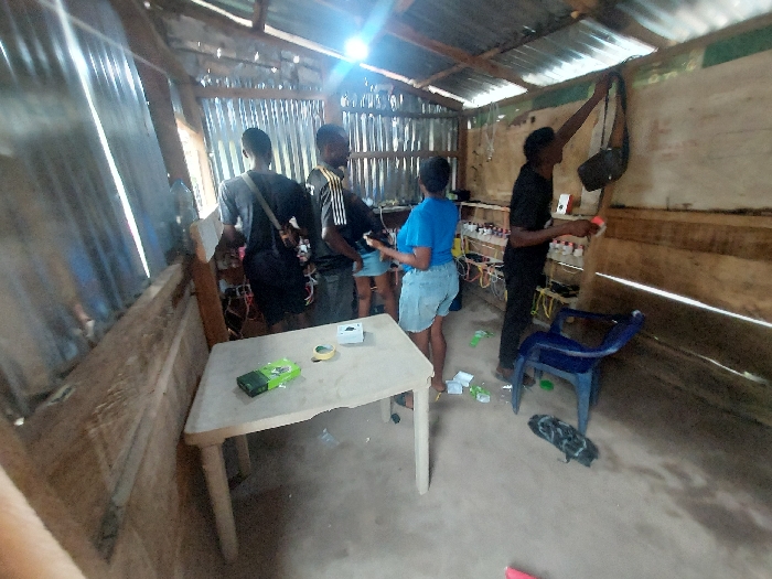 The image captures the interior of a utilitarian structure, potentially a workshop or small business, located in the city of Unknown, Unknown. The building features walls constructed from corrugated metal on the left and rough-hewn wooden planks on the right and rear, beneath a corrugated metal roof supported by wooden beams. The floor is unpaved earth or rough concrete. A bright overhead light source is prominent. Four individuals are present within the space. On the left, two males stand near a section of the wooden wall where exposed electrical wiring, circuit boards, and multiple battery packs or power modules are densely arranged. One male, viewed from behind, wears a dark t-shirt and shorts with a dark shoulder bag. The second male, facing left, wears a striped t-shirt. To the right, a female wearing a blue t-shirt and light denim shorts is positioned in front of a multi-tiered wooden shelving unit that holds numerous small, identical white containers with various colored caps (red, black, white). Her right hand is directed towards these items. To her right, a fourth male, dressed in a dark t-shirt and trousers, is in the process of hanging a dark messenger bag on the wooden wall, using his right hand, while holding a white cylindrical object in his left hand. In the foreground-middle, a light-colored rectangular table holds a green packaged box, a roll of yellow adhesive tape, and a small white object. A blue plastic chair and a crumpled dark fabric item are on the floor to the right of the table, amidst scattered small pieces of white and green debris. The scene suggests a functional workspace likely involved in the assembly, charging, or distribution of small electronic components or packaged goods.