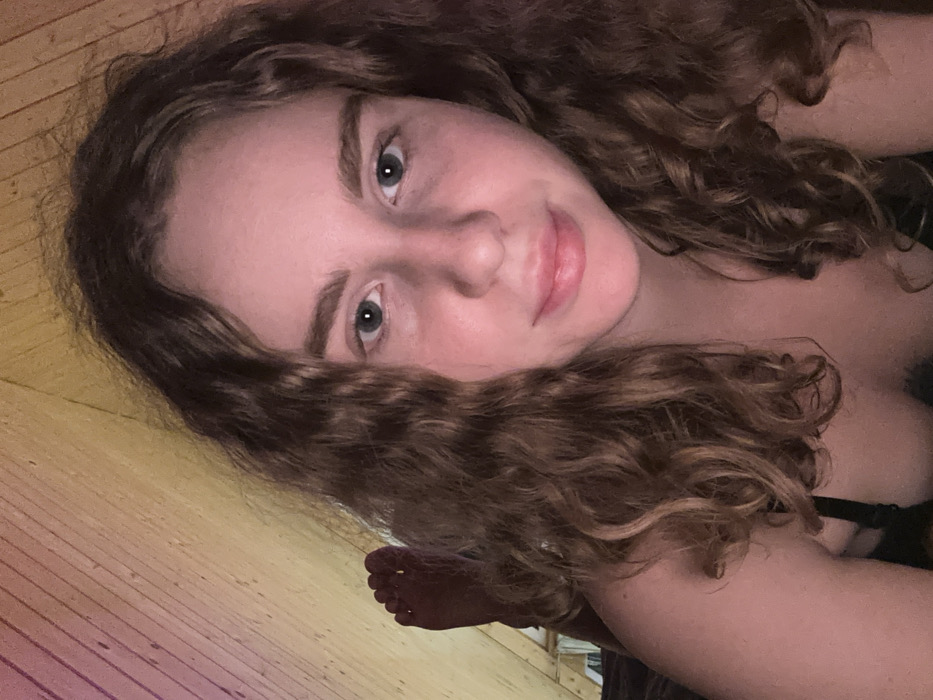 A young woman with curly brown hair and fair skin is positioned in the frame, tilted to the left