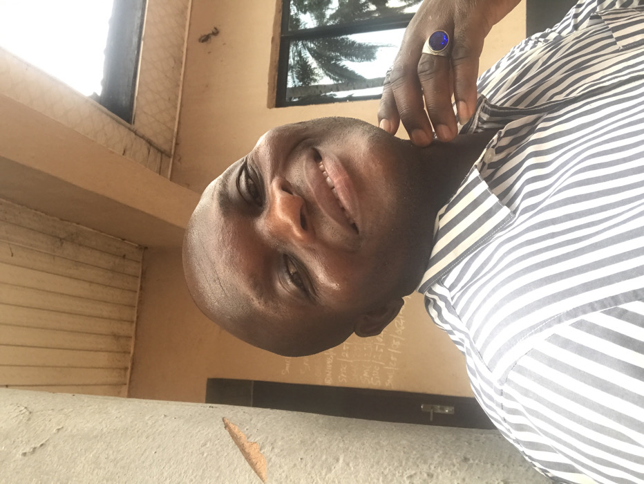 A bald, dark-skinned man smiles sideways. He wears a blue and white striped shirt, and a large blue ring is visible on his right hand. He appears to be outside, near a window with sunlight and partial views of trees. A beige-colored wall is in the background, with a possible chalkboard containing writing. The photo has been rotated.