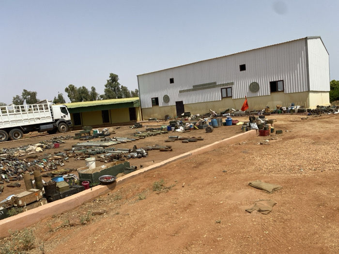 The image depicts an outdoor compound in Omdurman, Sudan, under clear daylight conditions. The ground is predominantly reddish-brown earth and gravel. A substantial accumulation of unexploded ordnance (UXO) and ammunition components, including various calibers of artillery shells, mortar rounds, and rocket-propelled grenade (RPG) warheads, is spread across the central and left portions of the unpaved area. Many items exhibit dirt and corrosion. A white flatbed truck is positioned on the left, parked in front of a smaller, single-story yellow building with a green roof. Dominating the right side of the image is a large, single-story industrial-style building constructed with white corrugated metal siding and a light yellow base, featuring several dark windows and small square apertures. Scattered throughout the compound are numerous objects, including blue plastic drums, metal containers, white buckets, and other debris. A red fabric item is visible near the larger white building. In the foreground, two burlap sacks rest on the ground. No personnel are visible within the frame, and the scene appears static.