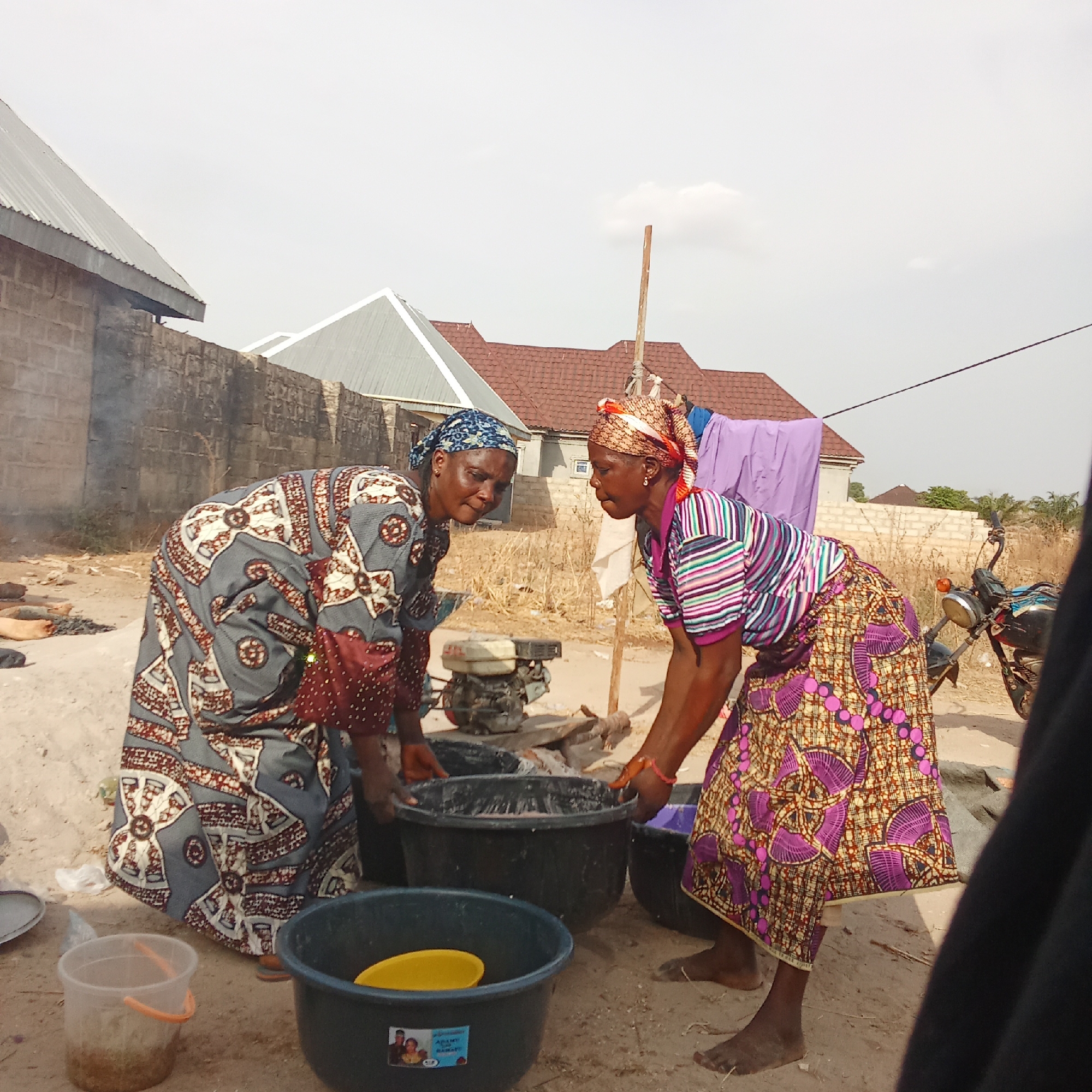 Two women are outdoors in a sandy area in Doma, Nigeria. They are lifting a large black tub between them. One woman is wearing a patterned gray and red dress with a blue headscarf, and the other is wearing a striped shirt and a purple and yellow patterned skirt with a red and orange headscarf. In front of them are two more black tubs and a clear plastic container. Behind them are a small engine, a wooden pole with clothes hanging on it, and a motorcycle. In the background, there are houses and vegetation.