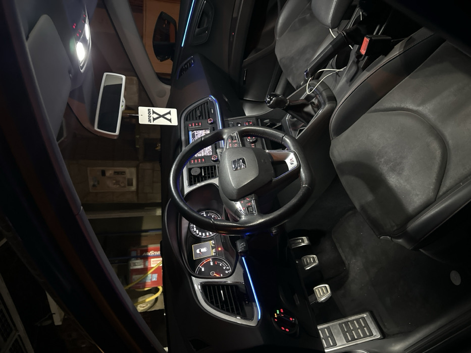 The image displays the interior of a dark-colored SEAT vehicle, viewed from the driver's seat during low light conditions