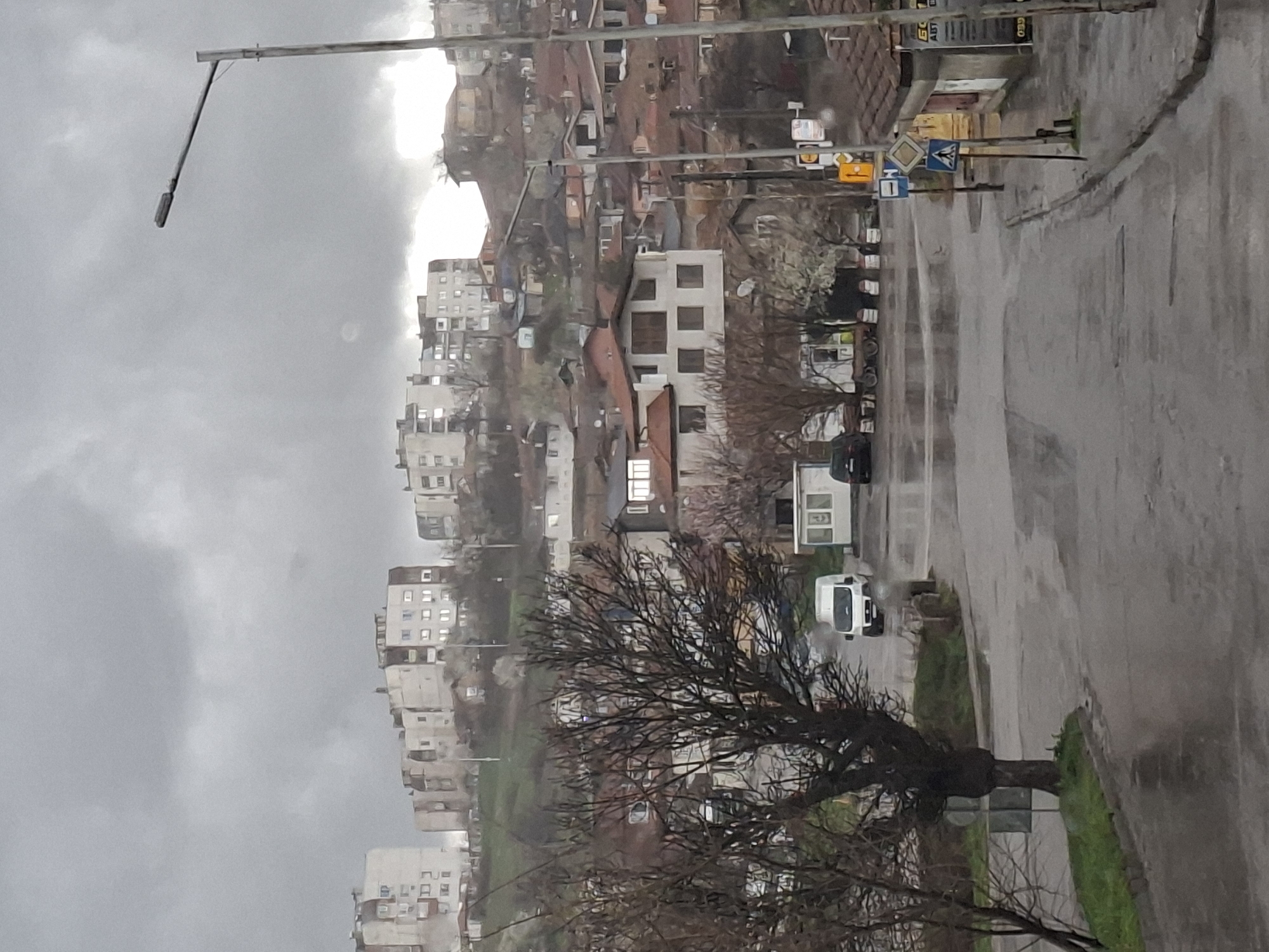 The image depicts an urban landscape in Shumen, Bulgaria, under an overcast, grey sky
