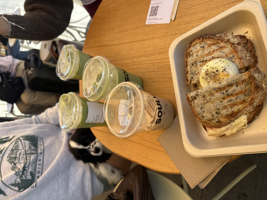 A tan, wooden table is set with three drinks in plastic cups, two green matcha teas, and one lighter-colored iced drink. A white paper receipt with a QR code sits nearby. A rectangular white tray holds a sandwich cut in half with a fried egg inside. The bread is grilled with visible seeds and a white sauce underneath. Part of a person in a white shirt with a green mountain design is visible, along with a small dog’s head.