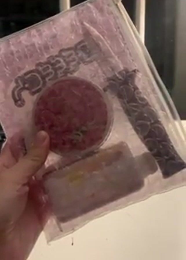 A hand is holding a transparent, zippered pouch with a "REBELS" sticker on it. Inside the pouch are three items: a round container filled with what appears to be potpourri or dried flowers, a small rectangular container with a label that says "Skin Perfect," and a hand-held implement that looks like a small pick or tool. The pouch is held in front of a blurred background of a window and a lamp. The items in the pouch are somewhat obscured by the reflective plastic material of the pouch itself.