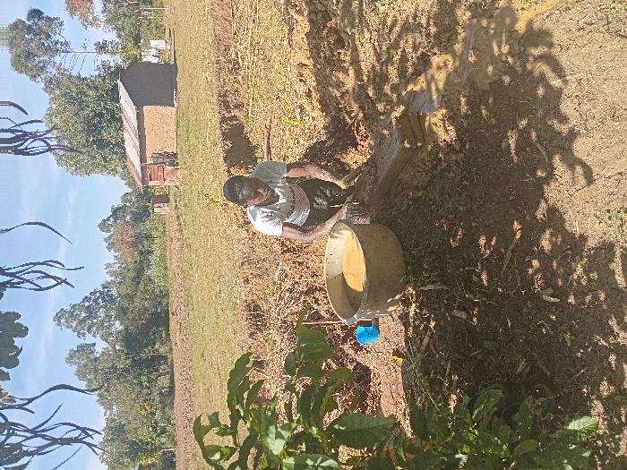 A man in a white t-shirt crouches near a ditch, next to a tan bucket