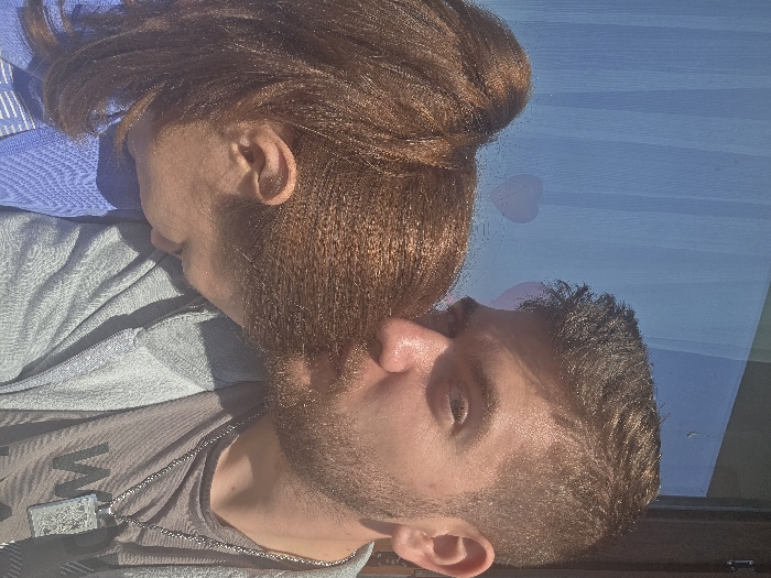 This image depicts two individuals, a male and a female, situated in Yagodovo, Bulgaria. The male, positioned on the right, has short dark brown hair and a trimmed beard. He is wearing a grey hooded jacket over a brown t-shirt that displays partial lettering and a silver chain necklace with a rectangular pendant. His left eye is visible, looking towards the viewer, and his lips are positioned against the top of the female's head. The female, on the left, has reddish-brown hair styled in a high ponytail. Her head is bowed and rests against the male's shoulder or upper chest. She is wearing a blue top with a textured pattern. The background consists of a light blue surface, possibly a window or curtain, showing two faint pink heart shapes. A dark vertical frame element is visible on the right side of the background. The scene is illuminated by natural light.