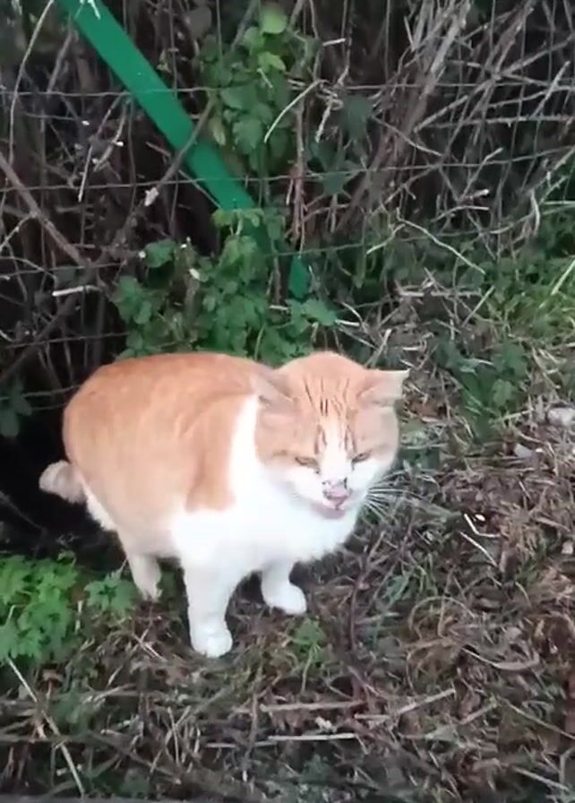 medium-sized cat standing on the ground near a hedge. The cat has orange and white fur. The ground is covered with dry leaves and some green plants. A green-painted metal post and wire fence are partially visible in the background behind the hedge. The cat looks around and then flicks its tongue to its nose. A gray stone block sits in the lower left corner of the frame.