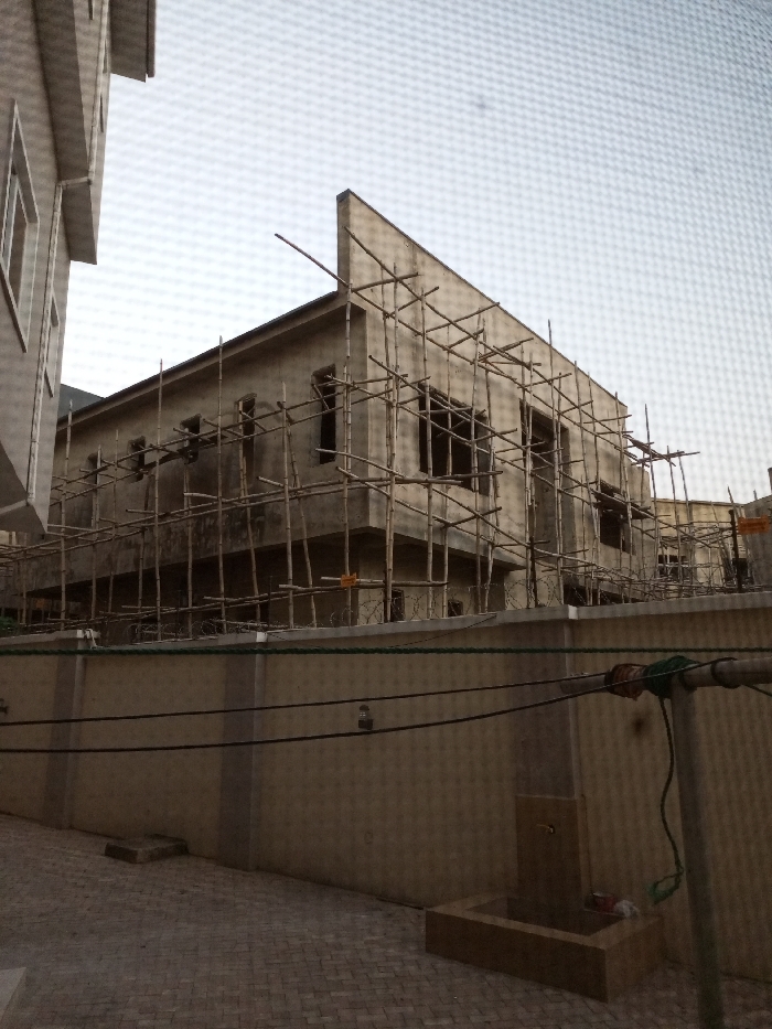 This image captures an outdoor scene in Guzape, Nigeria, depicting a multi-story concrete building under construction