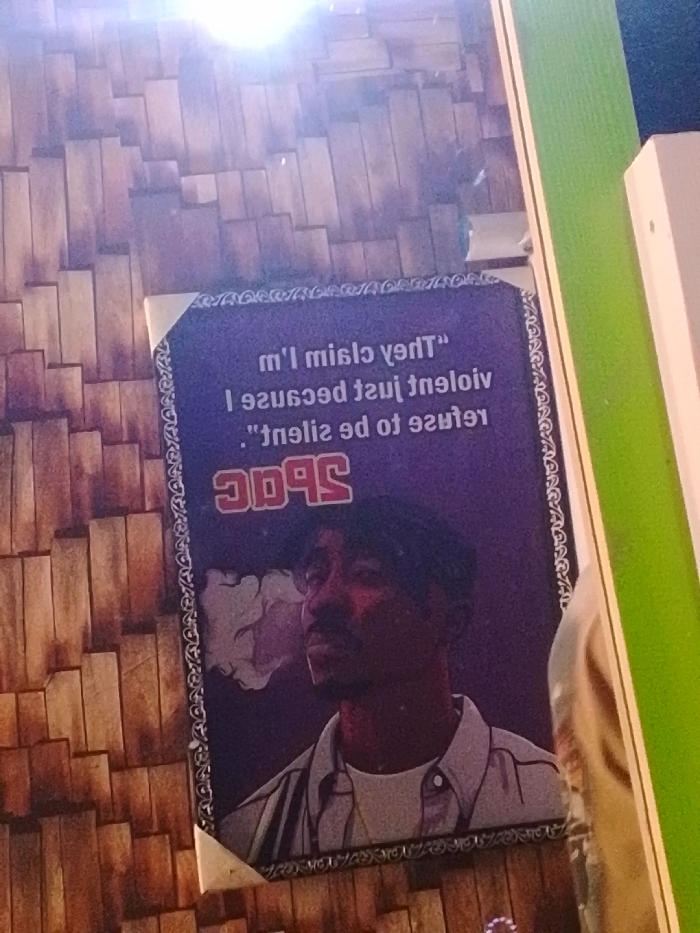 The scene is indoors, located in Enugwu-Ukwu, Nigeria. A vertically oriented rectangular poster, primarily purple in color, is mounted on a wall. The poster displays a mirrored illustration of rapper Tupac Shakur, depicted in profile, facing left, with a plume of smoke emanating from his mouth. He wears a dark cap and a light-colored collared shirt over a white undershirt. Above the illustration, a mirrored quote reads, "They claim I'm violent just because I refuse to be silent." Below the quote, the mirrored name "2PAC" is prominently displayed in red, uppercase letters. The poster features a decorative border around its perimeter and is secured at the corners by small, light-colored triangular fasteners. The wall behind the poster is covered with a textured paneling resembling stacked, irregular wooden planks in varying shades of brown. To the right of the poster, a vertical section of a bright green surface is visible, likely a wall or partition. Adjacent to this green surface on the right, a vertical white structural element is present. A significant glare from an overhead light source is visible in the upper center of the image, reflecting off the poster and the wooden wall.