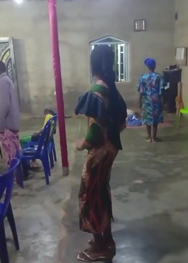 n indoor scene with a woman in a colorful dress standing with her back to the camera. She is wearing a dress that is patterned with shades of green, red, and brown, and has a ruffled black piece over her shoulders. She has long black hair down her back and brown shoes. In the background, there are other people sitting in chairs, standing, and milling about. Several blue plastic chairs are visible, along with a green plastic chair. A red pole is centrally positioned in the room. The room itself has simple, painted walls, a window with bars, and bare floors. A framed picture hangs on the wall. The lighting is provided by overhead bulbs, which are somewhat glaring. Music can be heard.